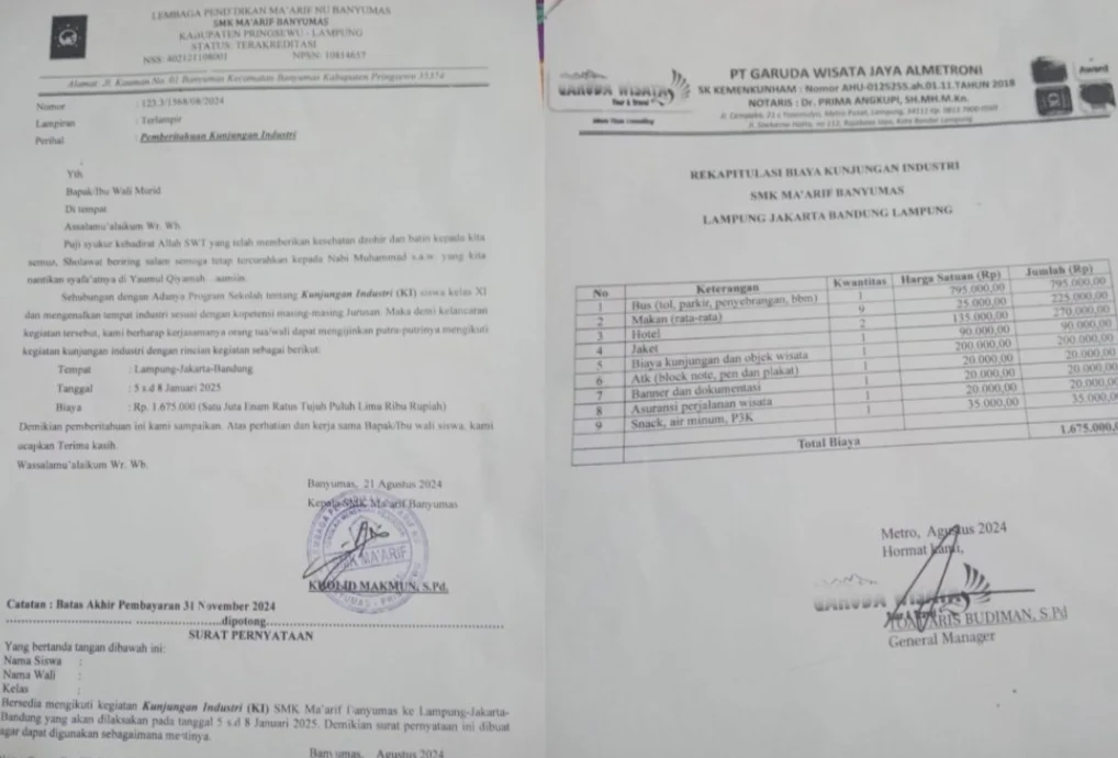 Pringsewu, SniperNew.id — Rencana kunjungan industri yang dirancang oleh SMK Maarif Kecamatan Banyumas, Kabupaten Pringsewu, menjadi sorotan para orang tua siswa. Dalam surat pemberitahuan yang disampaikan oleh pihak sekolah, kunjungan tersebut direncanakan akan berlangsung pada 5 hingga 8 Januari 2025, dengan destinasi ke Lampung, Jakarta, dan Bandung.