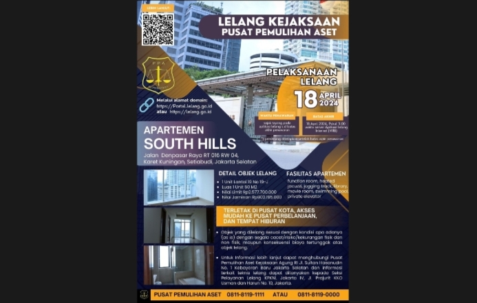 Jakar­ta, SniperNew.id — Badan Pemuli­han Aset Kejak­saan Agung akan melak­sanakan kegiatan aan­wi­jz­ing (pen­je­lasan lelang) ser­ta show unit atas barang ram­pasan beru­pa 4 (empat) unit aparte­men pada Kamis 4 April 2024.