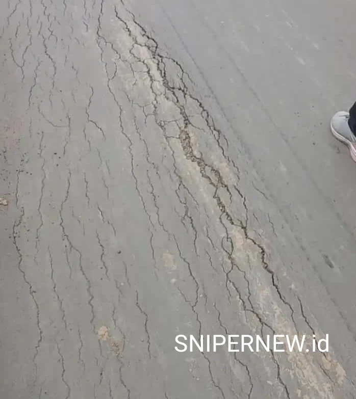 Retakan memanjang tampak jelas di sisi dan badan jalan, bahkan di beberapa titik mulai mengelupas, memunculkan kekhawatiran masyarakat akan daya tahan konstruksi ke depan.