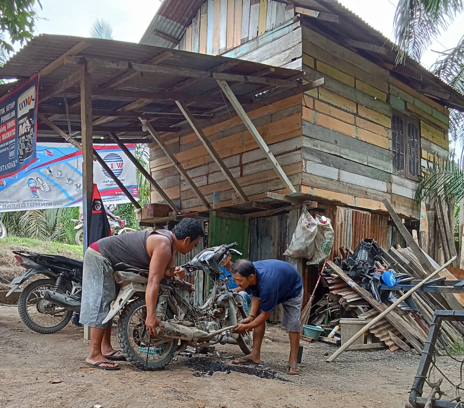 Labusel, snipernew.id — Menjalani Aktifitas sehari-hari warga desa air merah kecamatan kampung rakyat kabupaten labusel, Dalam keterbatasan fisik Hendra seorang warga yang berprofesi sebagai bengkel sepeda motor menjalani aktifitas dengan tekun dan sabar untuk meneruskan hidup, Senin 26 Agustus 2024.