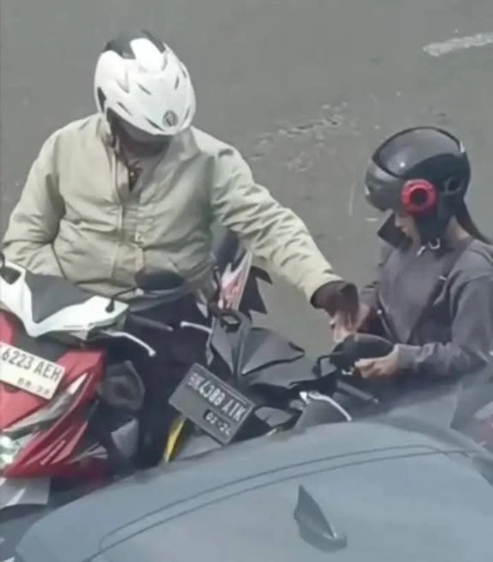 Foto yang diunggah oleh Muhammad Nabil memperlihatkan dua momen mencolok: satu gambar memperlihatkan pria berseragam polisi lalu lintas yang sedang berguling-guling di jalan, dan satu lagi menunjukkan seseorang diduga Aiptu RH tengah menerima uang dari seorang wanita.
