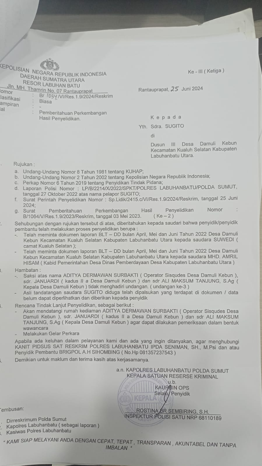 Walaupun pela­po­ran terse­but sudah menyi­ta wak­tu ham­pir Dua (2) tahun lamanya, Sesuai den­gan Surat Pem­ber­i­tahuan Perkem­ban­gan Hasil Penye­lidikan (SP2HP) yang ia ter­i­ma pada tang­gal surat 25 Juni 2024.