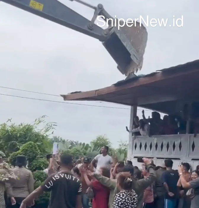 SniperNew.id – Sebuah video eksekusi rumah warga yang bertepatan dengan peringatan Hari Kemerdekaan 17 Agustus menjadi viral di media sosial. Peristiwa itu memperlihatkan ketegangan antara aparat yang menurunkan alat berat dengan warga yang mencoba bertahan di rumah mereka. Adegan dramatis terekam jelas ketika sejumlah warga, sambil mengibarkan bendera Merah Putih, menyanyikan lagu kebangsaan sebagai bentuk perlawanan moral.