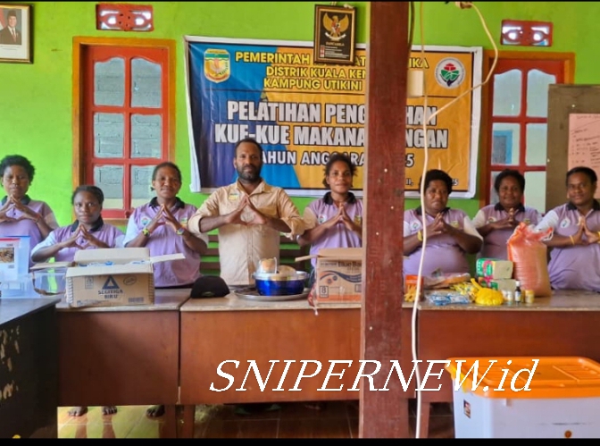 KUALA KENCANA, SNIPERNEW.id — Sejumlah ibu-ibu kader Posyandu Kampung Utikini II, Distrik Kuala Kencana, mengikuti pelatihan pembuatan kue dan makanan ringan, Senin (5/1/2026), di Balai Kampung Utikini II. Pelatihan ini dipandu langsung oleh Ketua PKK Kampung Utikini II, Helen Wanino, bersama sekretarisnya, Yokitera Kogoya, dan Bendahara PKK, Hermina Murib, Senin (05/1/2026).