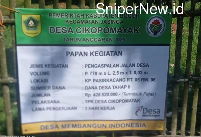 Bogor, SniperNew.id — Desa Cikopomayak, Kecamatan Jasinga, Kabupaten Bogor kembali menorehkan prestasi nyata dalam pembangunan infrastruktur desa. Melalui pemanfaatan Dana Desa (DD) tahap II Tahun Anggaran 2025, pemerintah desa setempat sukses merealisasikan proyek pengaspalan jalan utama di Kampung Pasirkacang RT 05 RW 06. Proyek ini menjadi bukti keseriusan pemerintah desa dalam meningkatkan kualitas hidup masyarakat sekaligus memperkuat akses mobilitas warga, Rabu (27/08/2025).
