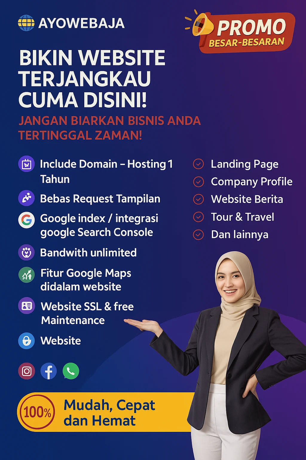 Menggelar promo spesial untuk jasa pembuatan website. Program ini menawarkan solusi lengkap mulai dari desain menarik, fitur fungsional, hingga konsultasi gratis bagi pelaku usaha dan personal brand yang ingin membangun kehadiran digital.