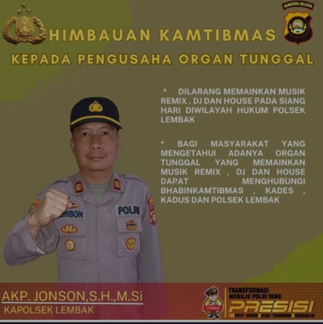 Muara Enim, SniperNew.id - Penegasan keras ditegaskan oleh Kapolsek Lembak Polres Muara Enim Polda Sumsel AKP Jonson, SH, MSi, Jika terdapat hiburan, baik itu melalui hiburan hajatan, maupun jenis hiburan lainnya, untuk tidak melakukan hiburan melalui musik jenis remix, Dj dan musik house diwilayah hukum Polsek LembakLembak kabupaten Muara Enim