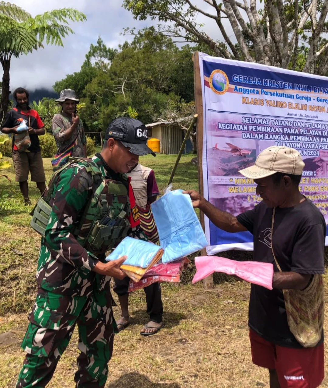 Papua, SniperNew.id — Satgas Yonif 641/Bru membagikan kebahagiaan dengan melaksanakan kegiatan berbagi pakaian langsung door to door ke warga di Distrik Apalapsili, Kabupaten Yalimo, Papua Pegunungan, (11/09/2024).