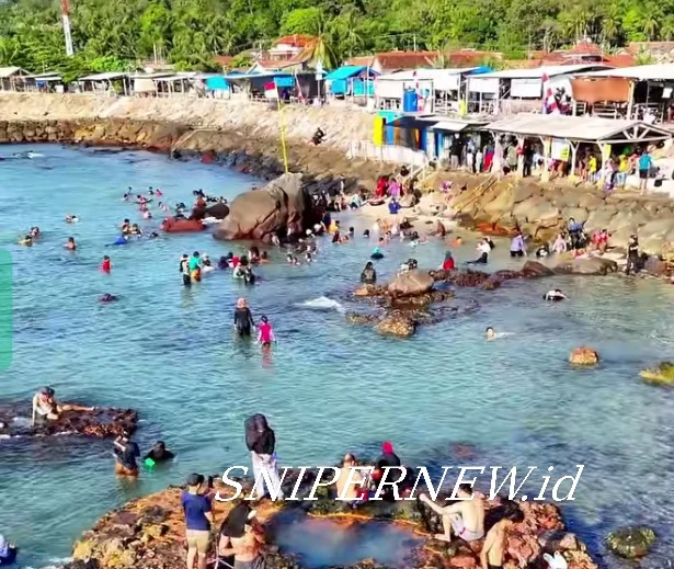 Dalam video tersebut tampak puluhan pengunjung memadati area pantai berbatu, sebagian berenang di laut dangkal, sementara lainnya berkumpul di sekitar titik sumber air panas yang muncul di sela-sela bebatuan karang.