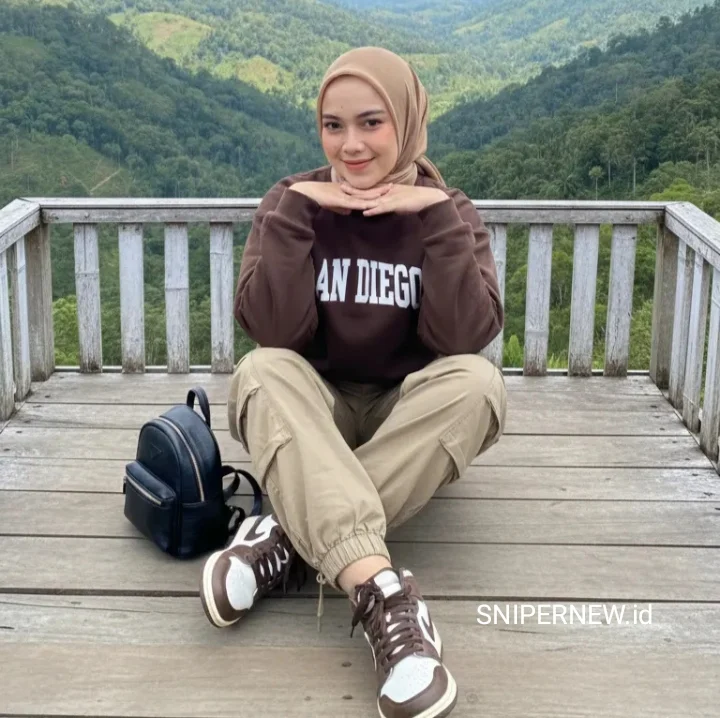 Perempuan tersebut mengenakan hijab berwarna cokelat muda, sweater cokelat bertuliskan “SAN DIEGO”, celana panjang krem, serta sepatu bernuansa cokelat dan putih