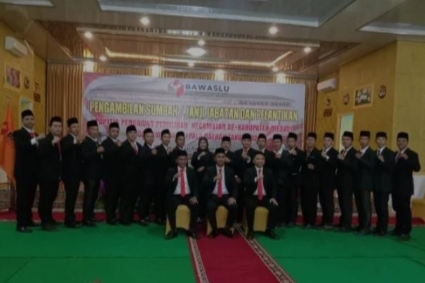 Pelantikan 21 Panitia Pengawas Pemilihan Kecamatan yang ada di Kabupaten Mesuji, dilakukan Ketua Bawaslu Kabupaten Mesuji, Deden Cahyono Putra di hadapan tamu undangan yang hadir.