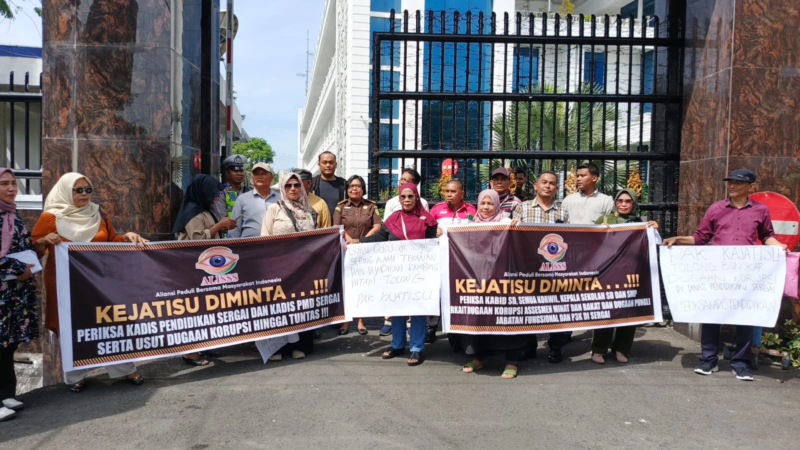 membawa sepanduk dan kertas karton bertuliskan permintaan kepada Kejatisu agar memeriksa dan mengusut dugaan KKN (Korupsi,Kolusi dan Nepotisme), dan Pungli (Pungutan liar) ebagai bentuk kekecewaan mereka terhadap Dinas Pendidikan Sergai dan Dinas PMD Sergai.