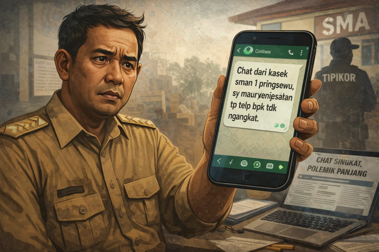 Sebelumnya diberitakan, sebuah pesan WhatsApp yang diteruskan Kacabdin kepada jurnalis DPC Komite Wartawan Reformasi Indonesia (KWRI) memunculkan tanda tanya karena memuat kalimat yang menyebut pengaduan telah disikapi oleh Tipikor di sekolah dan disebut telah selesai.