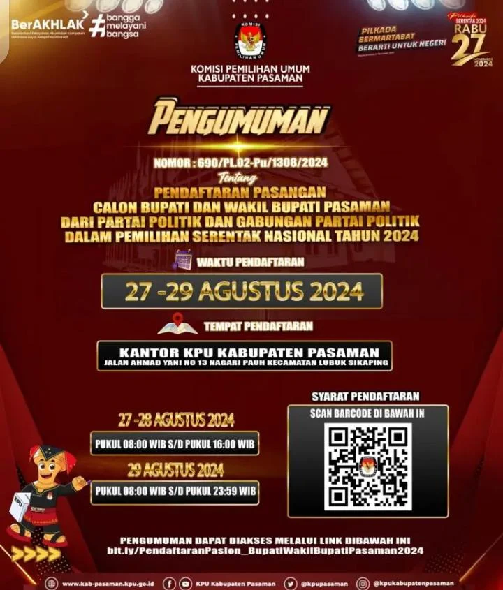 Bah­wa untuk melak­sanakan keten­tu­an Pasal 95 ayat (1) Per­at­u­ran KPU Nomor 8 Tahun 2024 ten­tang Pencalo­nan Guber­nur dan Wak­il Guber­nur, Bupati dan Wak­il Bupati, ser­ta Waliko­ta dan Wak­il Waliko­ta, Komisi Pemil­i­han Umum Kabu­pat­en Pasaman mengu­mumkan Pendaf­taran Pasan­gan Calon Bupati dan Wak­il Bupati Pasaman Tahun 2024.( Ade putra )