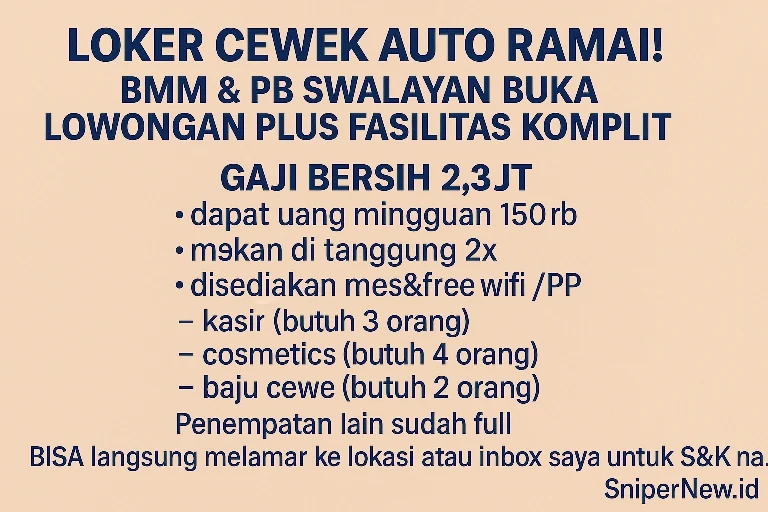 Lam­pung, SniperNew.id – Selasa, 15 Juli 2025, Kabar gem­bi­ra datang bagi para pen­cari ker­ja wani­ta di wilayah Gad­in­gre­jo dan Sukarame. Dua pusat per­be­lan­jaan ter­na­ma, BMM Gad­in­gre­jo dan PB Swalayan Sukarame, sedang mem­bu­ka lowon­gan ker­ja besar-besaran untuk posisi kasir, pen­ja­ga kos­metik, dan pen­ja­ga toko baju wani­ta. Infor­masi ini per­ta­ma kali diung­gah oleh akun Face­book berna­ma Ibuu Mega dua menit lalu dan lang­sung menyi­ta per­ha­t­ian war­ganet.