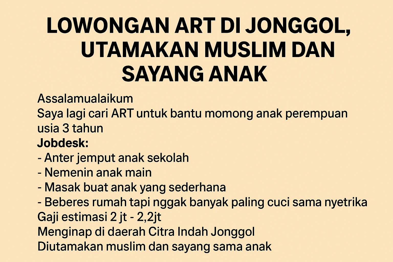 Dalam unggahan tersebut, pemilik akun menyampaikan secara jelas kebutuhan akan seorang ART yang bisa menginap di rumahnya yang berlokasi di daerah Citra Indah, Jonggol. Pekerjaan ini ditujukan untuk membantu mengurus seorang anak perempuan berusia tiga tahun.