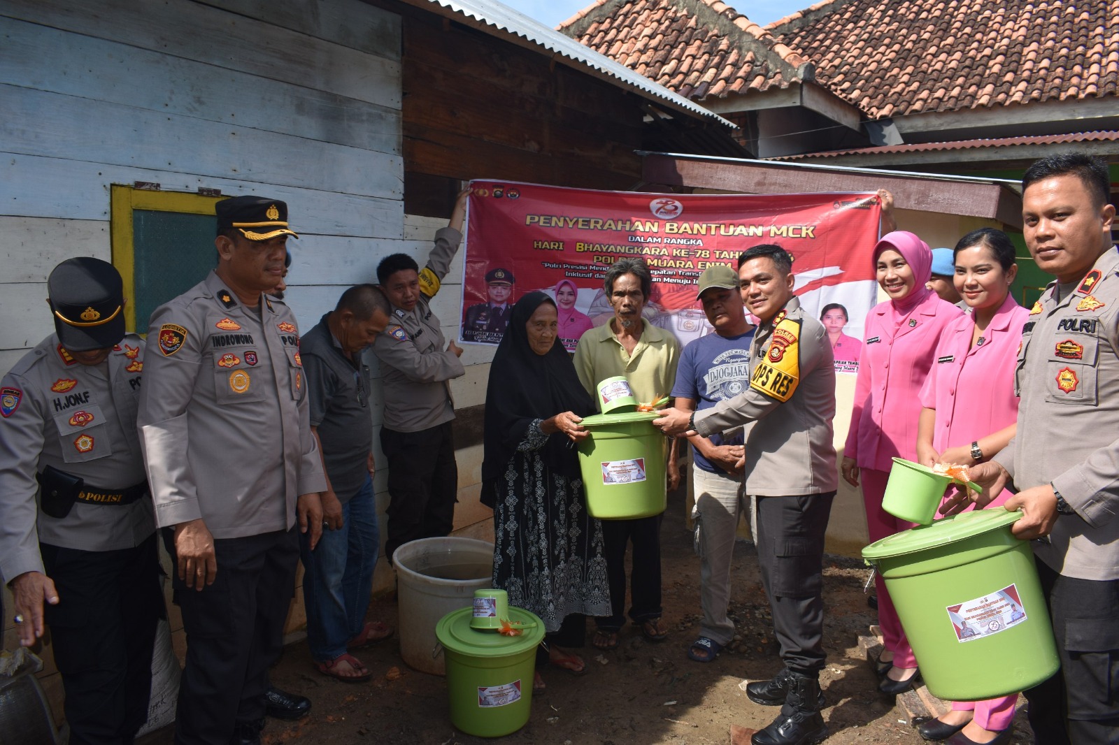 Kapolres Muara Enim, AKBP Jhoni Eka Putra, SH, SIK, MSi, bersama Ketua Bhayangkari Cabang Muara Enim, Ibu Livi Jhoni Eka Putra, Waka Polres Muara Enim, Kompol Roy Arpian Tambunan, SP, SIK, para Pejabat Utama Polres Muara Enim, dan Pengurus Bhayangkari Cabang Muara Enim, secara simbolis menyerahkan tiga unit fasilitas sarana MCK kepada warga, yakni Eva Ismawati, Siti Husna, dan Hermaudin, , Sabtu, (29/06/2024).