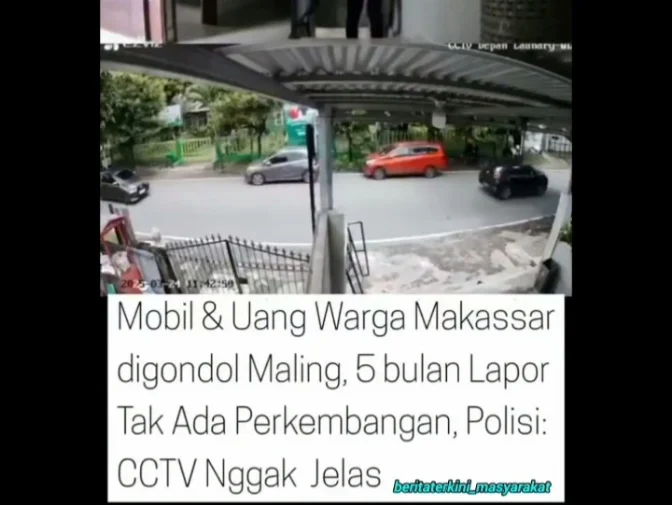 “Mobil & Uang Warga Makassar digondol Maling, 5 bulan Lapor Tak Ada Perkembangan, Polisi: CCTV Nggak Jelas,” tulis keterangan video dalam unggahan itu, yang menampilkan dua rekaman CCTV satu di dalam rumah, satu di jalan depan rumah menunjukkan pelaku memasuki rumah dan mobil yang kabur di jalan sempit kawasan permukiman.