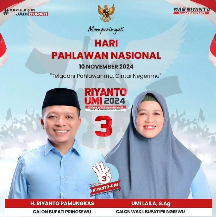 Pringsewu, SniperNew.id — Hari pahlawan diperingati pada 10 November setiap tahunnya. Pasangan Calon (Paslon) Bupati dan Wakil Bupati Pringsewu, nomor urut 3, H. Riyanto Pamungkas — Umi Laila, S.Ag., mengucapkan selamat memperingati hari Pahlawan, dengan mengucapkan terimakasih dan do’a untuk para pahlawan kita, Minggu (10/11/2024).