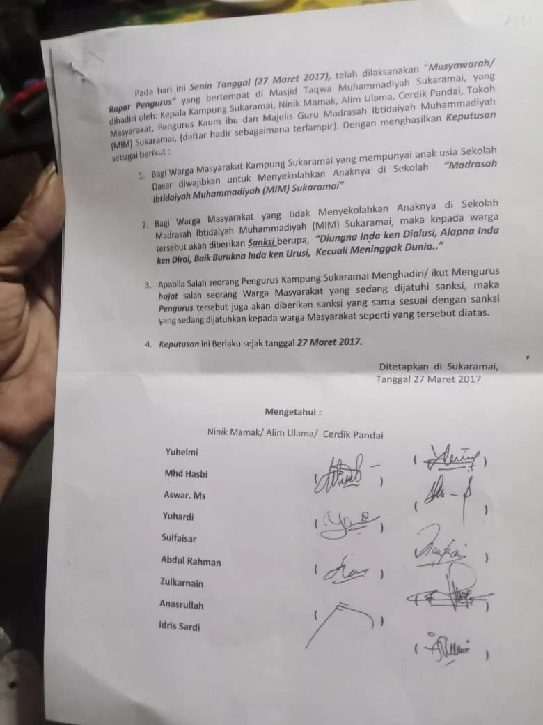 “Karena aturan tersebut adalah hasil musyawarah dan kesepakatan bersama masyarakat Sukaramai pada tahun 2017 yang dilengkapi dengan berita acara musyawarah dan tanda tangan persetujuan masyarakat.” katanya.