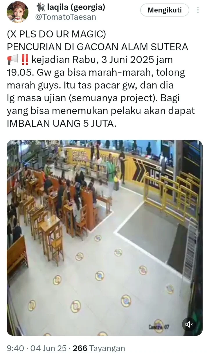 Tangerang Selatan, SniperNew.id — Sebuah aksi pencurian tas dilaporkan terjadi di restoran Mie Gacoan cabang Alam Sutera pada Rabu malam, 3 Juni 2025, sekitar pukul 19.05 WIB. Peristiwa tersebut diungkap melalui unggahan viral akun media sosial X (dahulu Twitter) @TomatoTaesan yang meminta bantuan publik untuk menemukan pelaku.