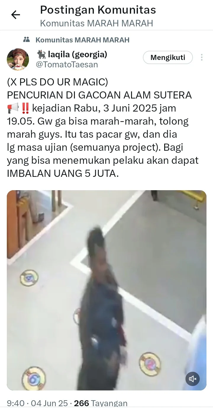 “Kami benar-benar butuh bantuan. Kalau ada yang lihat kejadian atau bisa bantu identifikasi pelaku, tolong hubungi saya. Imbalannya Rp5 juta,” tulis @TomatoTaesan dalam seruan terbuka kepada netizen.