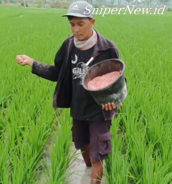 Lampung, SniperNew.id - Gambar ini menangkap momen penuh makna: seorang petani muda sedang menabur pupuk di tengah hamparan sawah hijau yang subur. Dengan tangan kirinya ia membawa ember berisi pupuk, dan tangan kanannya aktif menyebarkannya ke tanaman padi satu per satu. Tanpa alas kaki, ia melangkah mantap di tengah lumpur, menyatu dengan alam dan kehidupan desa, Kamis 17 Juli 2025.