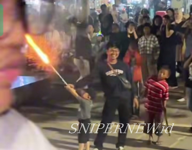 Seorang anak memegang petasan menyala di kawasan Pantai Losari, Makassar, saat malam pergantian tahun, disaksikan warga sekitar. Aksi tersebut terekam video dan viral di media sosial karena dinilai berpotensi membahayakan keselamatan publik.