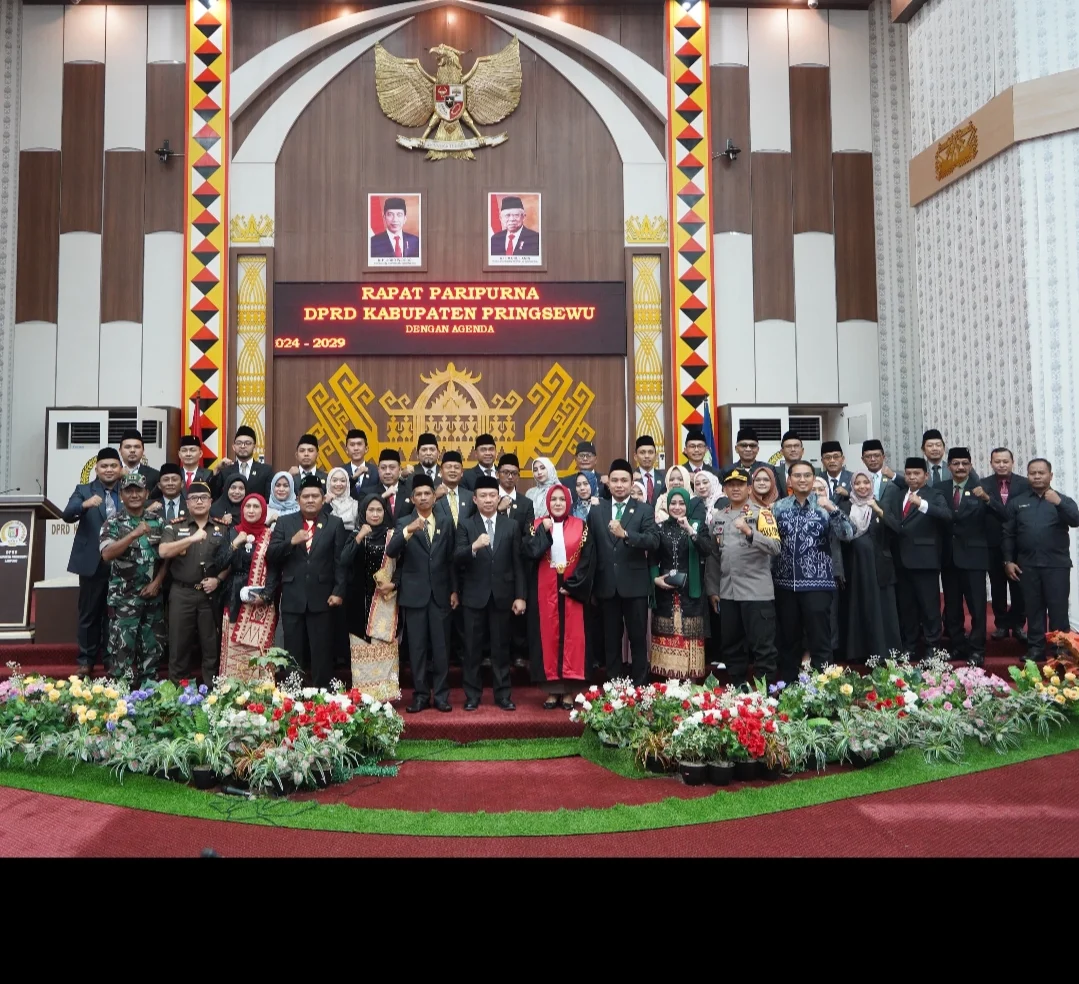 Pringsewu, SniperNew.id — Pimpinan DPRD Kabupaten Pringsewu periode 2024–2029 dilantik dan diambil sumpah oleh Ketua Pengadilan Negeri Kotaagung Eva Susiana, pada Rapat Paripurna DPRD Kabupaten Pringsewu, Jumat (18/10/2024).