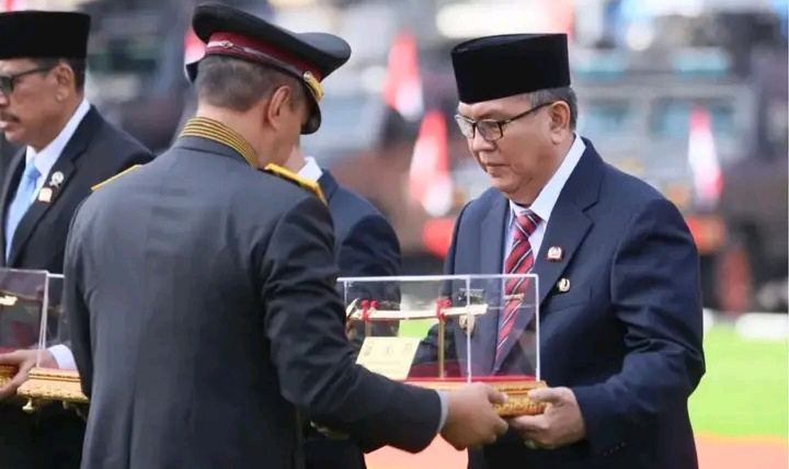 Palembang, SniperNew.id — Kapolri Jendral Listyo Sigit Prabowo memberikan penghargaan kepada Pj. Bupati Muara Enim, Dr. H. Ahmad Rizali, M.A., atas dukungan Pemkab. Muara Enim memberikan hibah pembangunan rehab Kantor Polres Muara Enim yang diserahkan langsung oleh Kapolda Sumatera Selatan (Sumsel), Irjen. Pol. A. Rachmad Wibowo, S.I.K., pada Upacara Peringatan Hari Bhayangkara ke-78 Tahun 2024 di Halaman Polda Sumsel, Senin (01/07/2024).