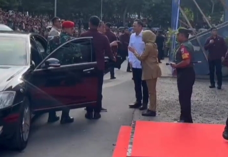 Setibanya di GOR Tawangalun Presiden Joko Widodo disambut masyarakat banyuwangi, Bupati Banyuwangi Ipuk Frestiandani, Mentri PAN RB Abdulah Azwar Annas Dan Mentri PUPR Basuki Hadimuljiono.