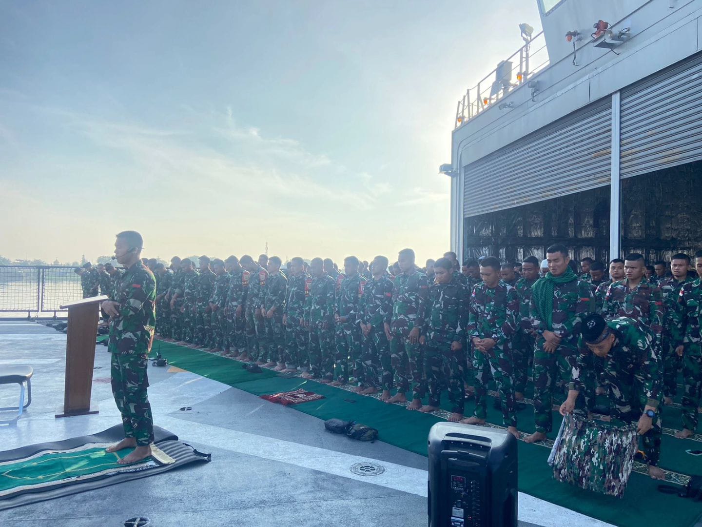 “Momen sholat idul adha kali ini cukup berbe­da bagi kami per­son­il sat­gas Pam­tas kewil­aya­han RI-PNG dari yang biasanya sholat ber­ja­maah di masjid kami yang ada di asra­ma kali ini kami melak­sanakan sholat di atas KRI” ucap Dany­onif 141/AYJP Letkol Inf Syurya Dhar­ma sete­lah melak­sanakan sholat.
