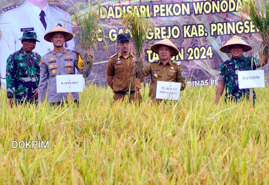 Pringsewu, SniperNew.id — Penjabat Bupati Pringsewu Marindo Kurniawan melakukan panen perdana padi demplot metode Tanpa Olah Tanah (TOT) musim tanam Gadu 2024 di Persawahan Gapoktan Dadisari, Pekon Wonodadi, Kecamatan Gadingrejo, Kabupaten Pringsewu, Senin (9/9/2024).
