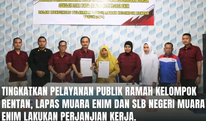 Muara Enim,Snipernew.id– Dalam Rang­ka meningkatkan Pelayanan Pub­lik , Lapas Muara Enim meng­gan­deng Seko­lah Luar Biasa (SLB) Negeri Muara Enim ‚den­gan melakukan Penan­datan­ganan Ker­ja Sama terkait Penye­di­aan Layanan bagi Penyan­dang Dis­abil­i­tas. Kamis 08/08/2024.