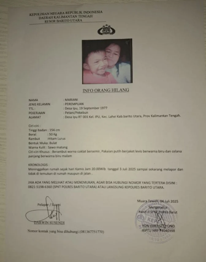 Muara Teweh, SniperNew.id – Seorang warga perempuan asal Desa Ipu, Kecamatan Lahei, Kabupaten Barito Utara, Provinsi Kalimantan Tengah, dilaporkan hilang sejak Kamis malam, 3 Juli 2025. Pihak Kepolisian Resor Barito Utara telah mengeluarkan informasi resmi mengenai orang hilang tersebut dan meminta bantuan masyarakat untuk turut mencari keberadaan korban.