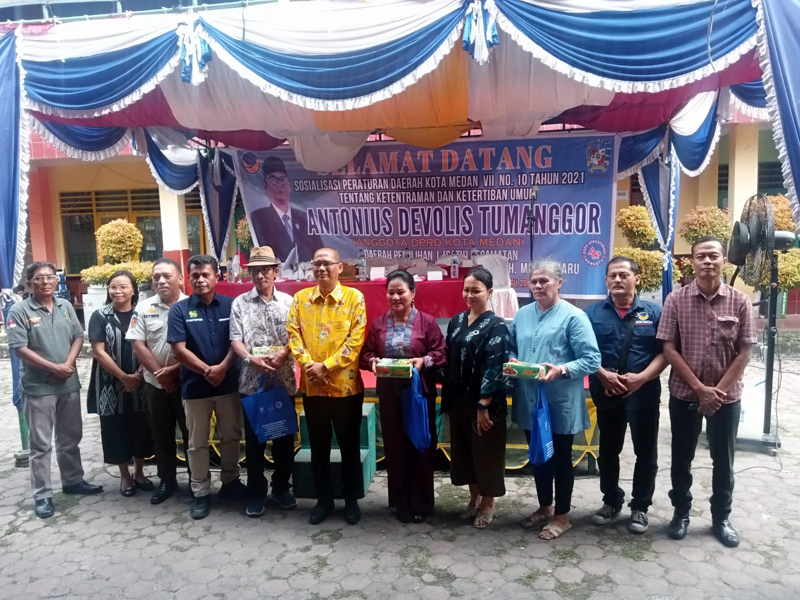 Antonius Devolis Tumanggor S.Sos, Anggota Komisi IV DPRD Kota Medan dari Fraksi Partai NasDem melaksanakan Sosialisasi Peraturan Daerah (Sosperda) Nomor 10 Tahun 2021 tentang Ketertiban dan Ketentraman Kota Medan di Jl. Aster Raya, Kel. Helvetia Tengah, Kec. Medan Helvetia, pada Minggu.(20/7/25)